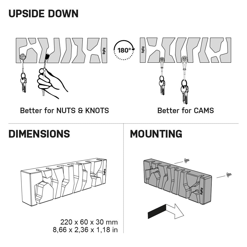 A climbing key holder designed to hang your keys in the most original style. Features seven cracks for you to hang your keys using keychains in the form of small climbing nuts/stoppers or knots. Makes the perfect gift for any climber.