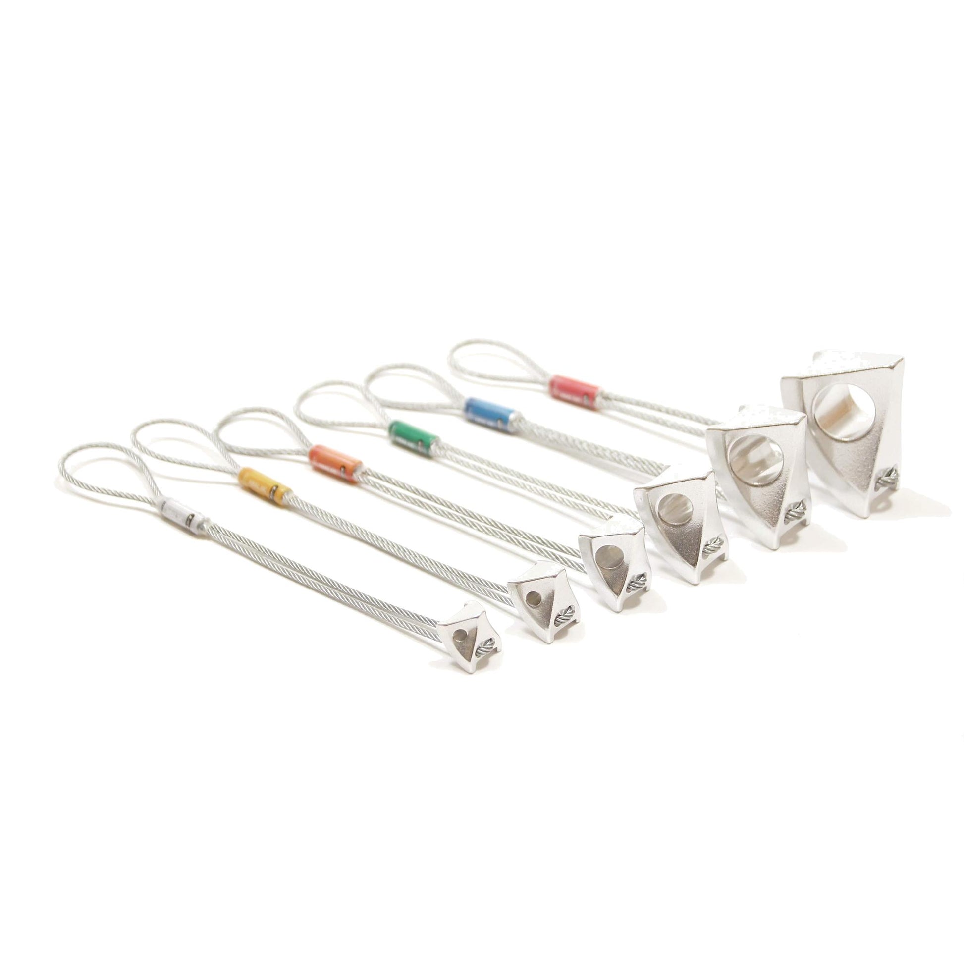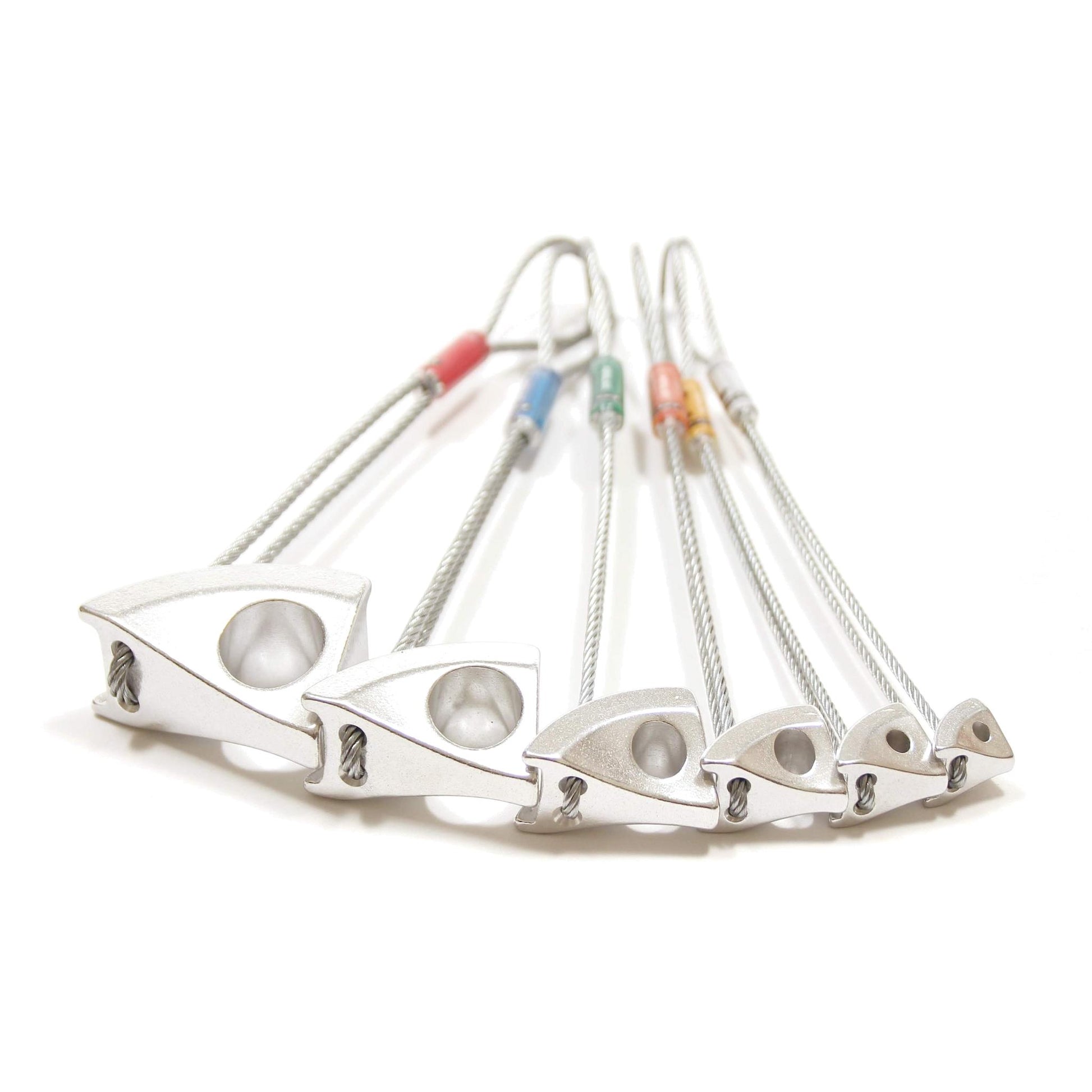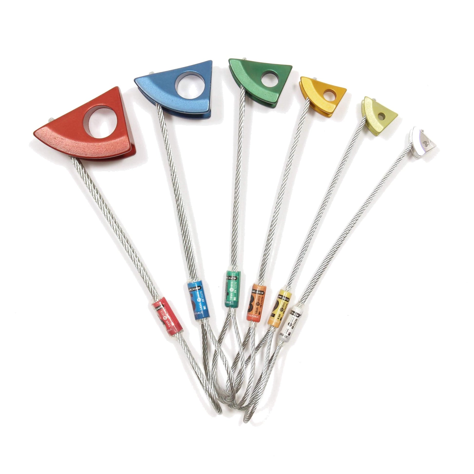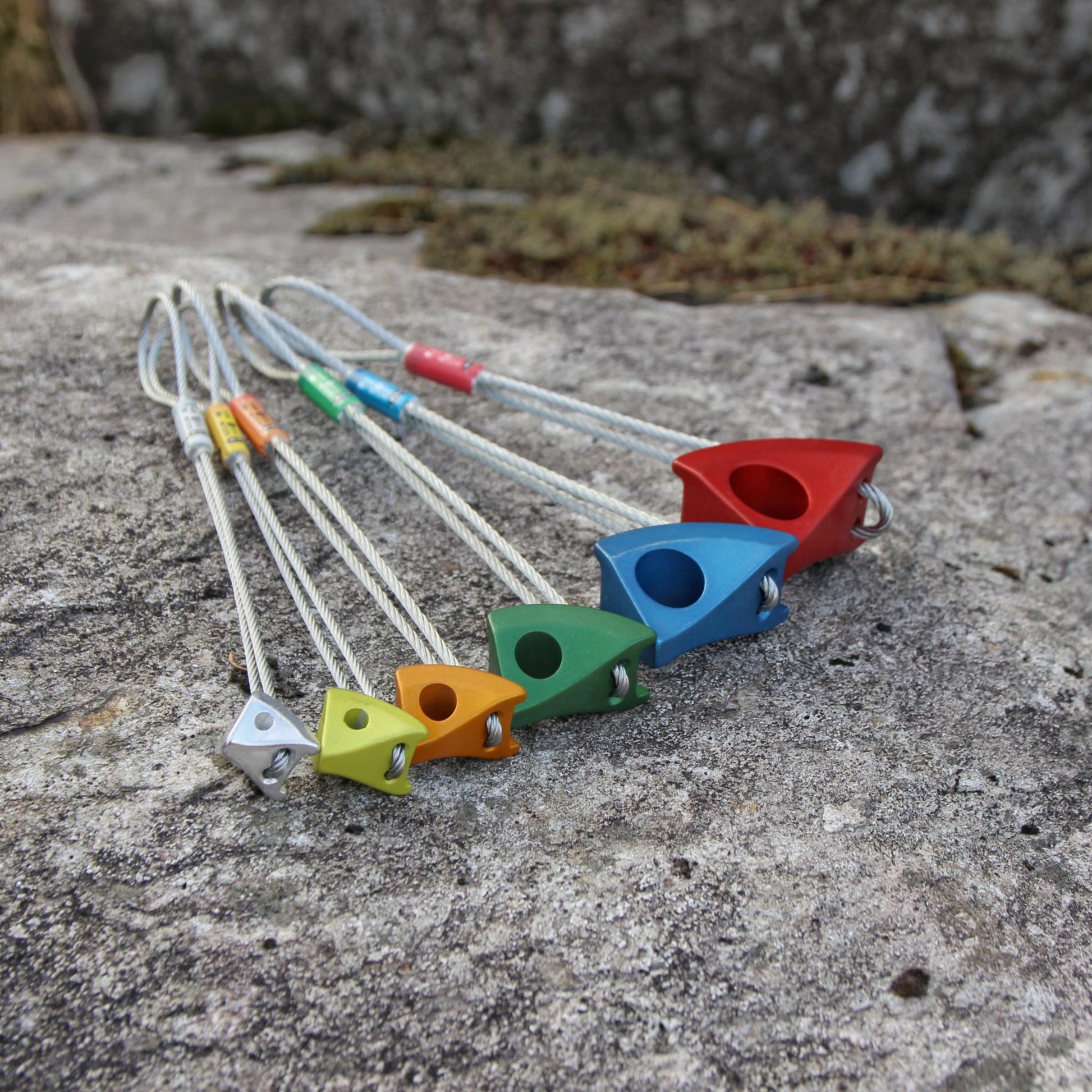 A unique design of passive protection, designed to ‘cam’ into breaks and pockets with no moving parts. Affixed to a durable steel wire, Abalaks have a narrow V-shaped head and come in a variety of sizes, ideal for protecting horizontal cracks and small pockets, particularly quarry shot-holes, where the traditional cam does not fit.
