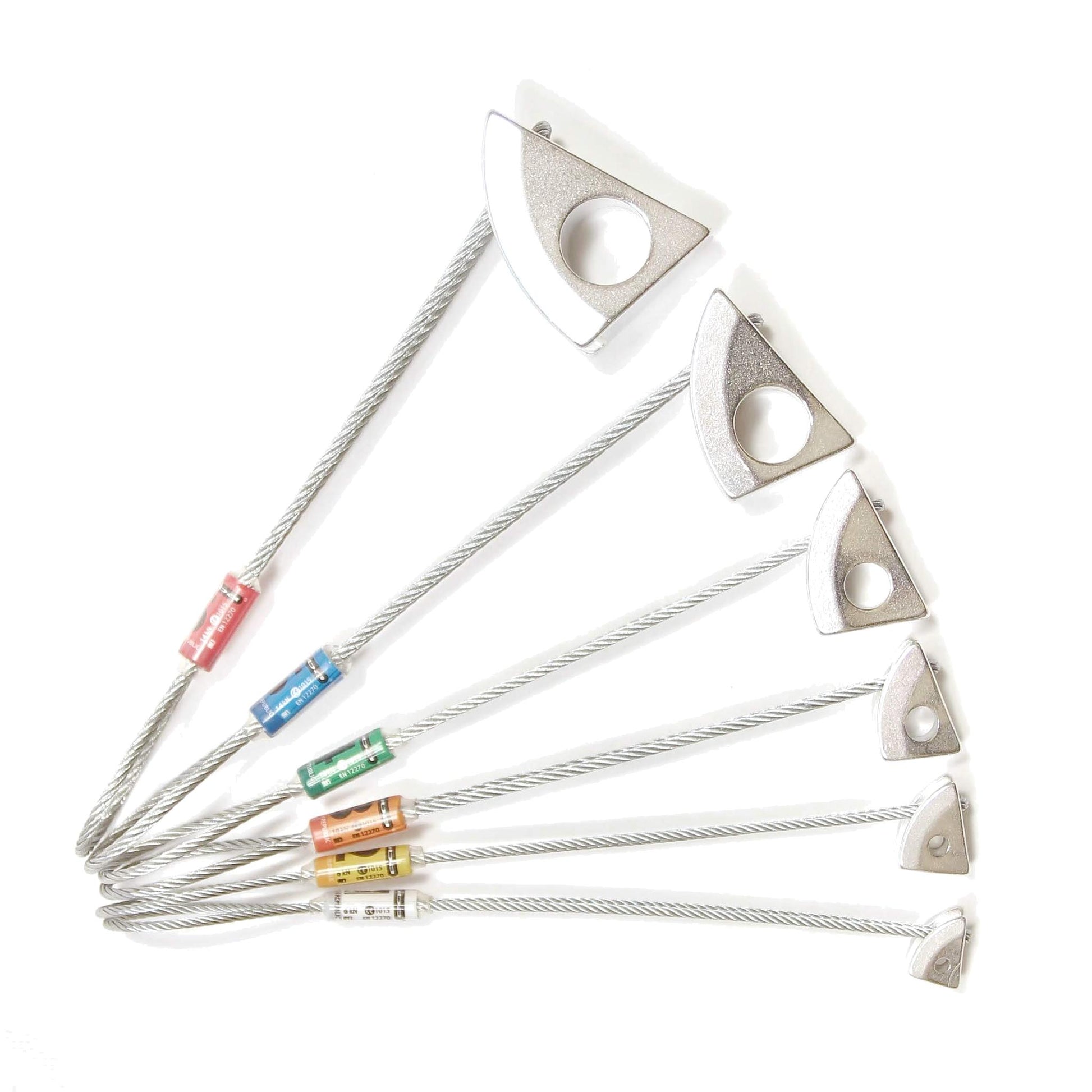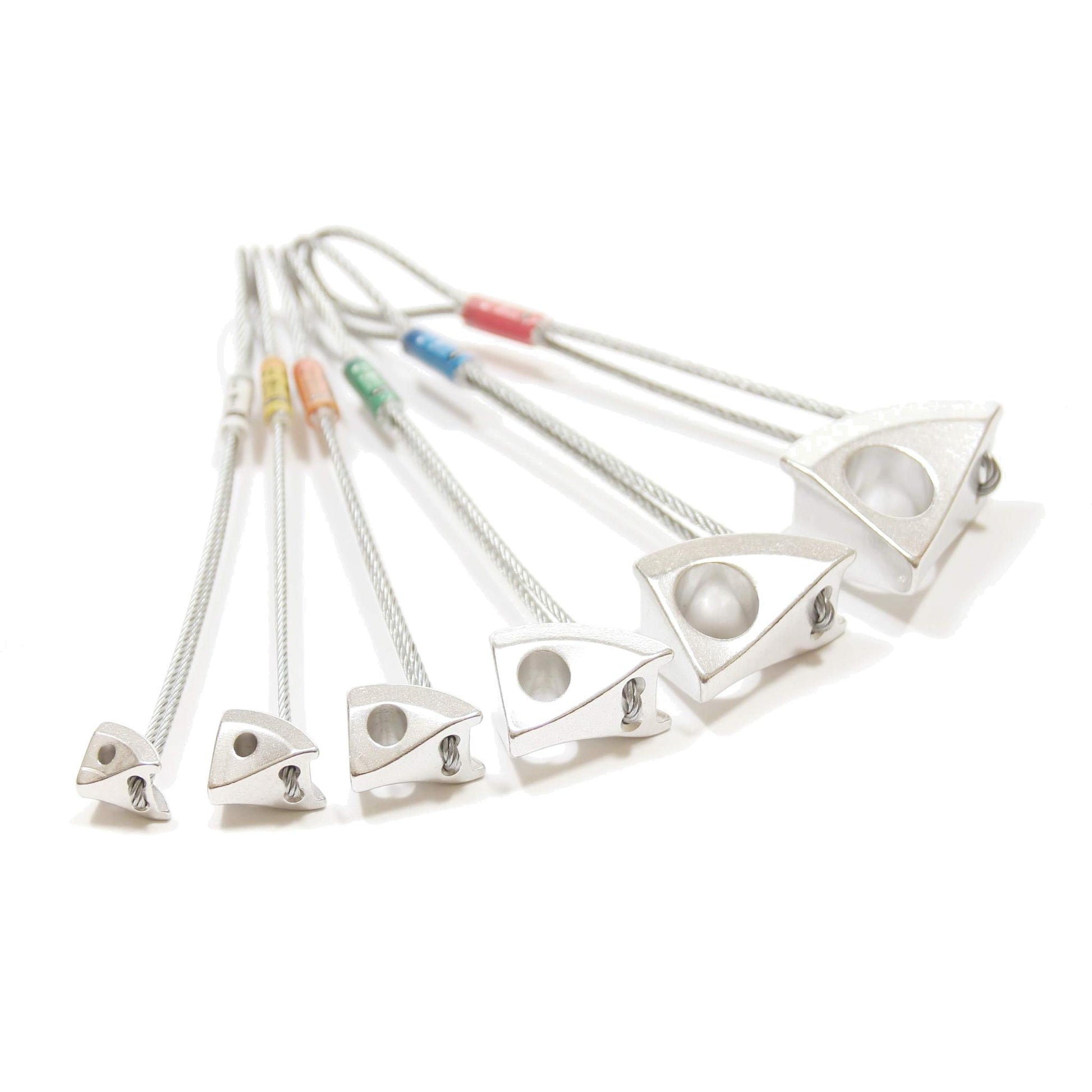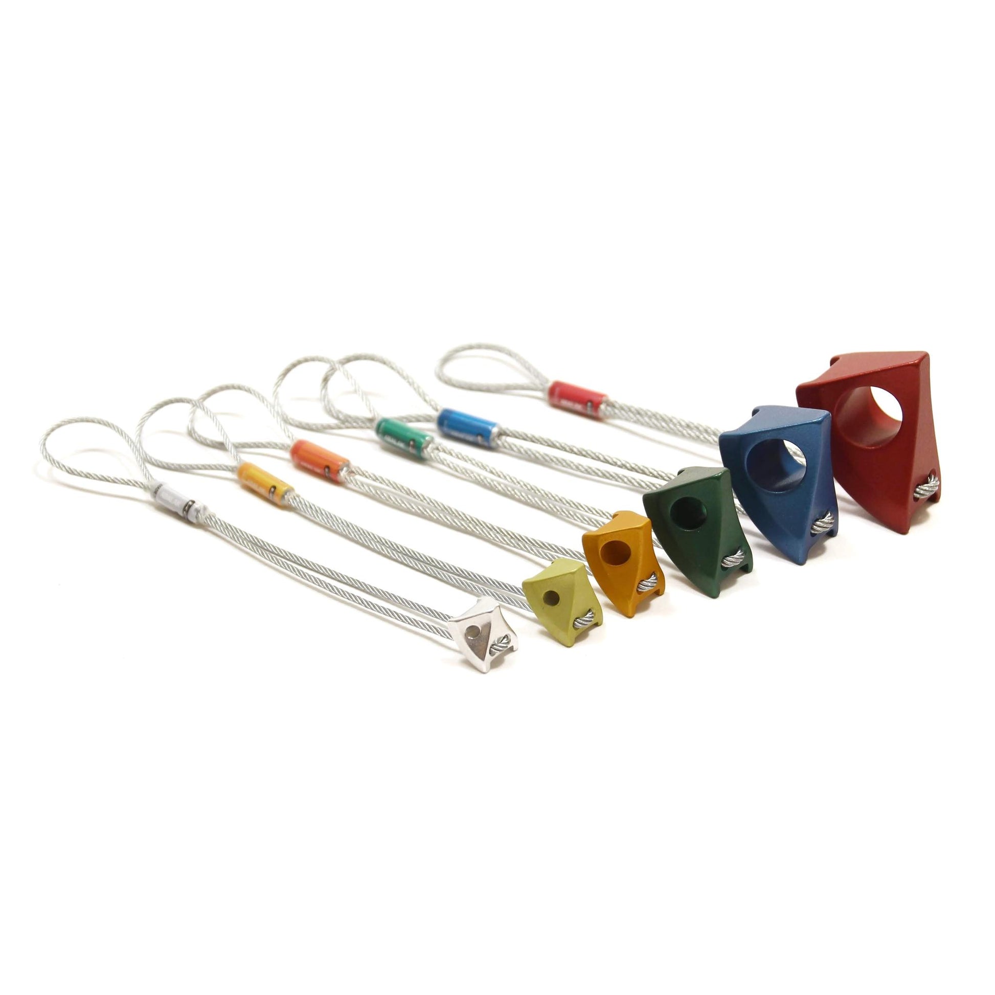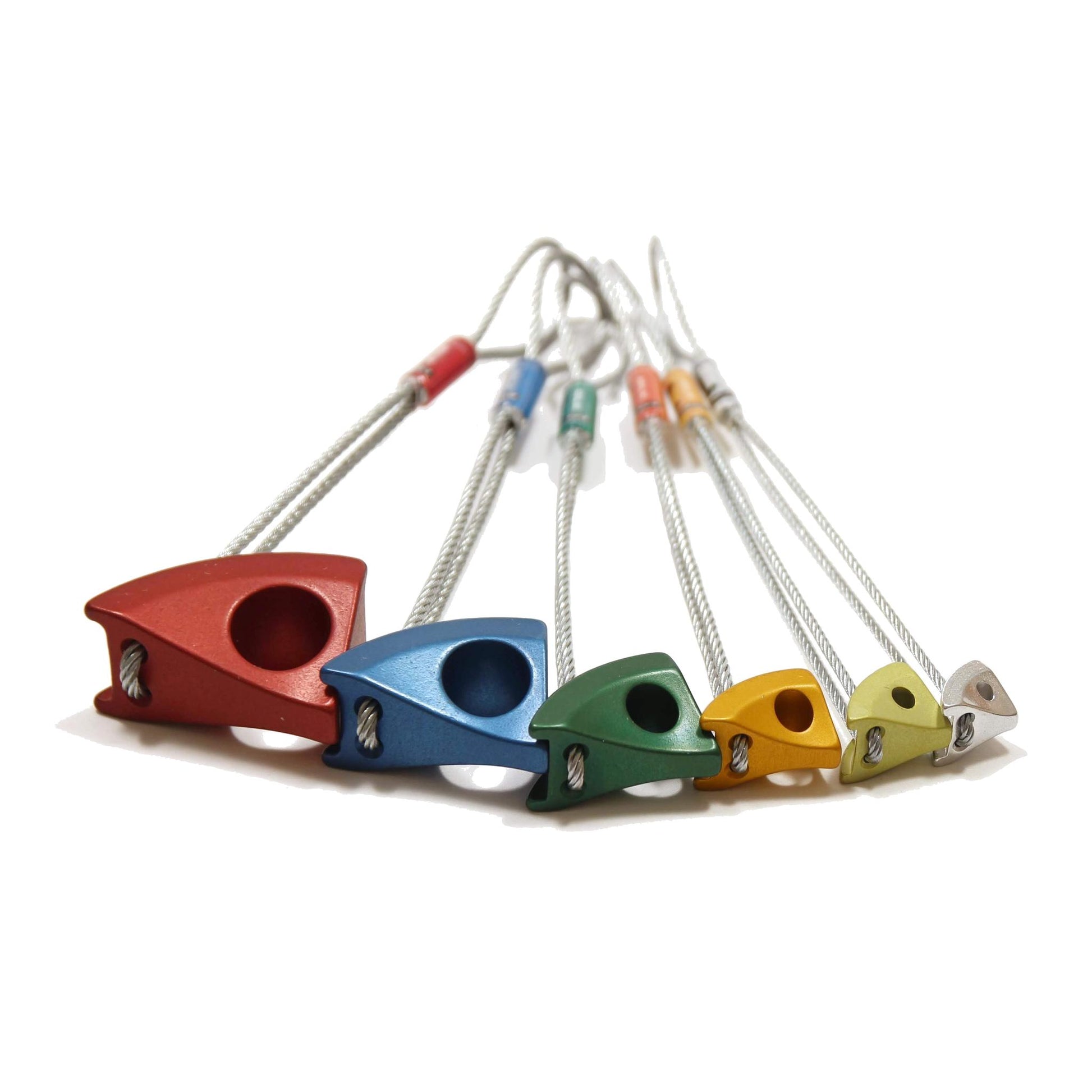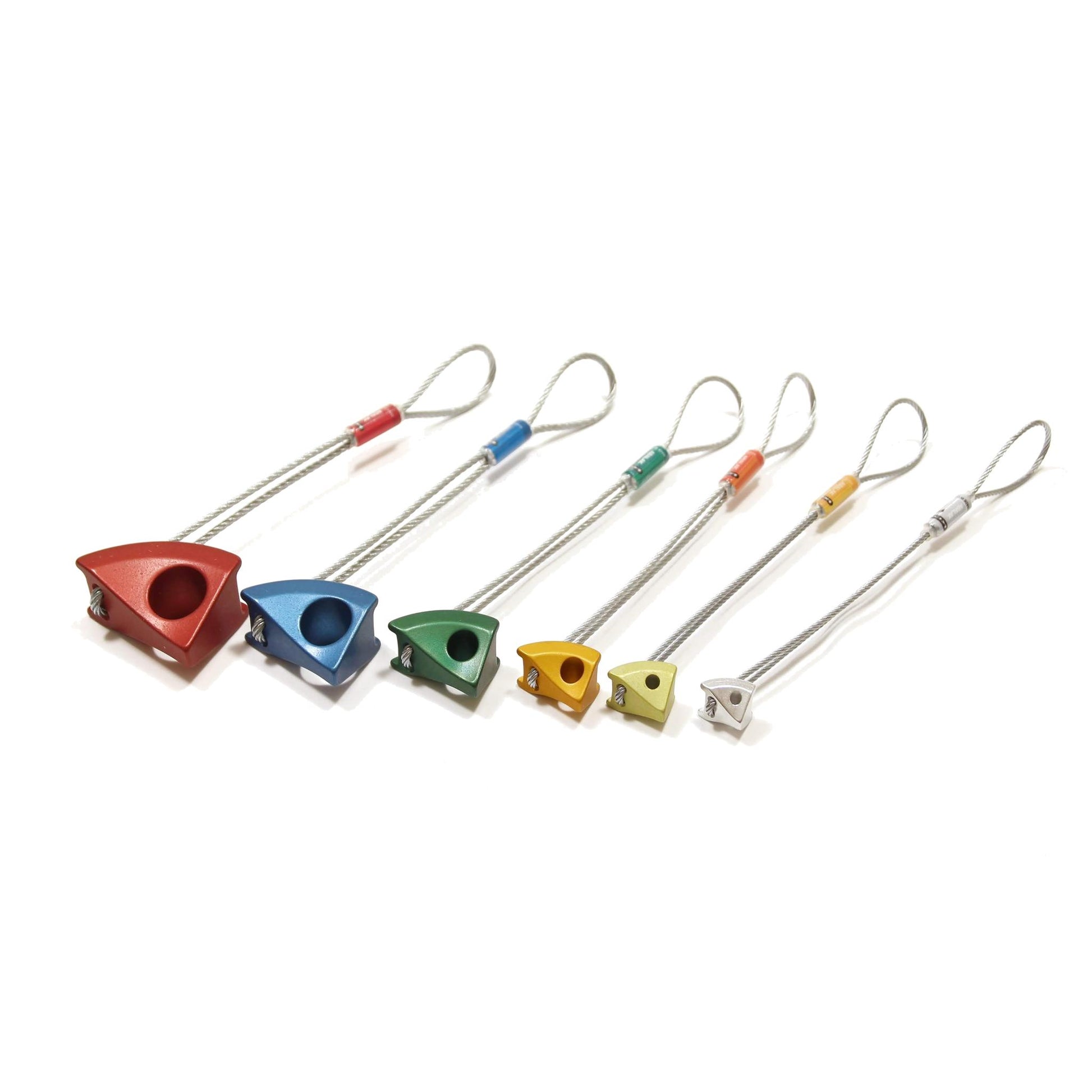 A unique design of passive protection, designed to ‘cam’ into breaks and pockets with no moving parts. Affixed to a durable steel wire, Abalaks have a narrow V-shaped head and come in a variety of sizes, ideal for protecting horizontal cracks and small pockets, particularly quarry shot-holes, where the traditional cam does not fit.